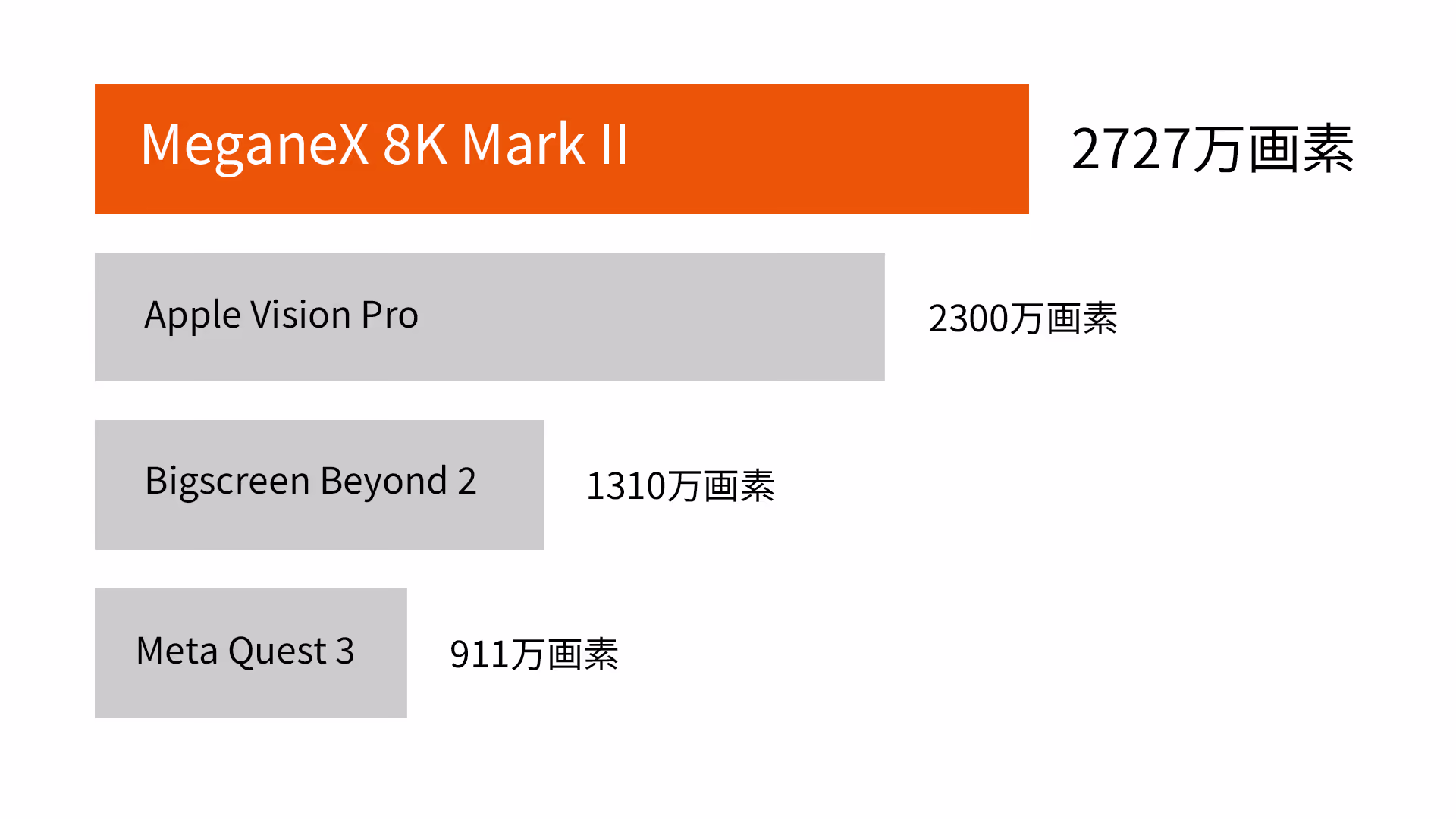 片目4K解像度(3552 x 3840 ピクセル)を画素数に換算すると2727万画素。2025年10月現在のコンシューマー向けVRヘッドセットの中ではトップクラスの画素数を誇ります。