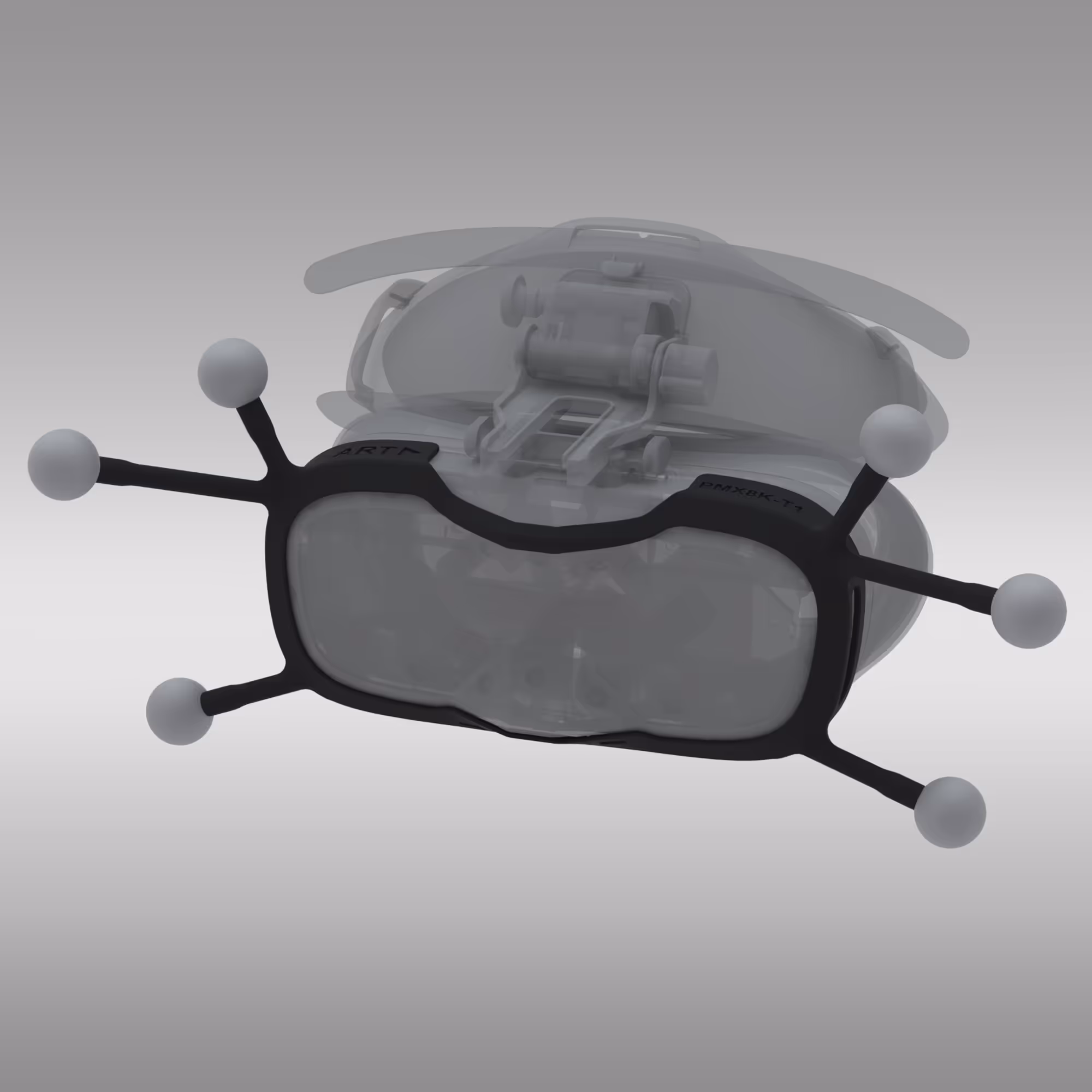 MeganeX 8K Mark II は、Advanced Realtime Tracking(ART)社製のカスタムターゲットを装着することで、ART社の光学式アウトサイドインモーショントラッキングシステムとシームレスに連携できます。これにより、大規模なスペースでも高精度かつプロフェッショナルなトラッキングが可能となり、可動式シミュレーターや車両内での使用にも対応します。